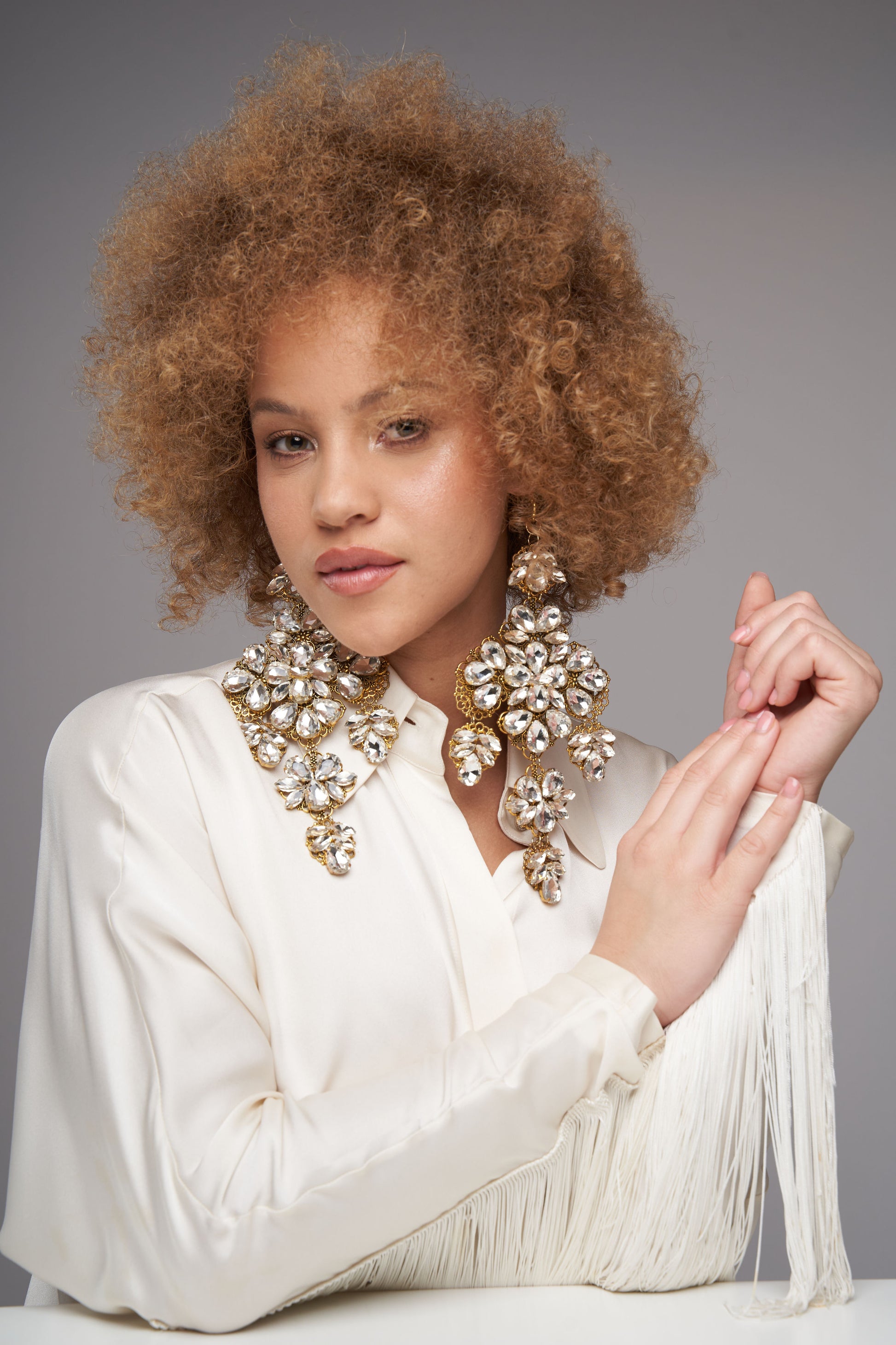 The Rhinestone collection offers an elegant take on the iconic Franci style. Refined details and striking shapes provide sculptural appeal as cascading clear and champagne crystals dance on a delicate gold tone chandelier style frame.