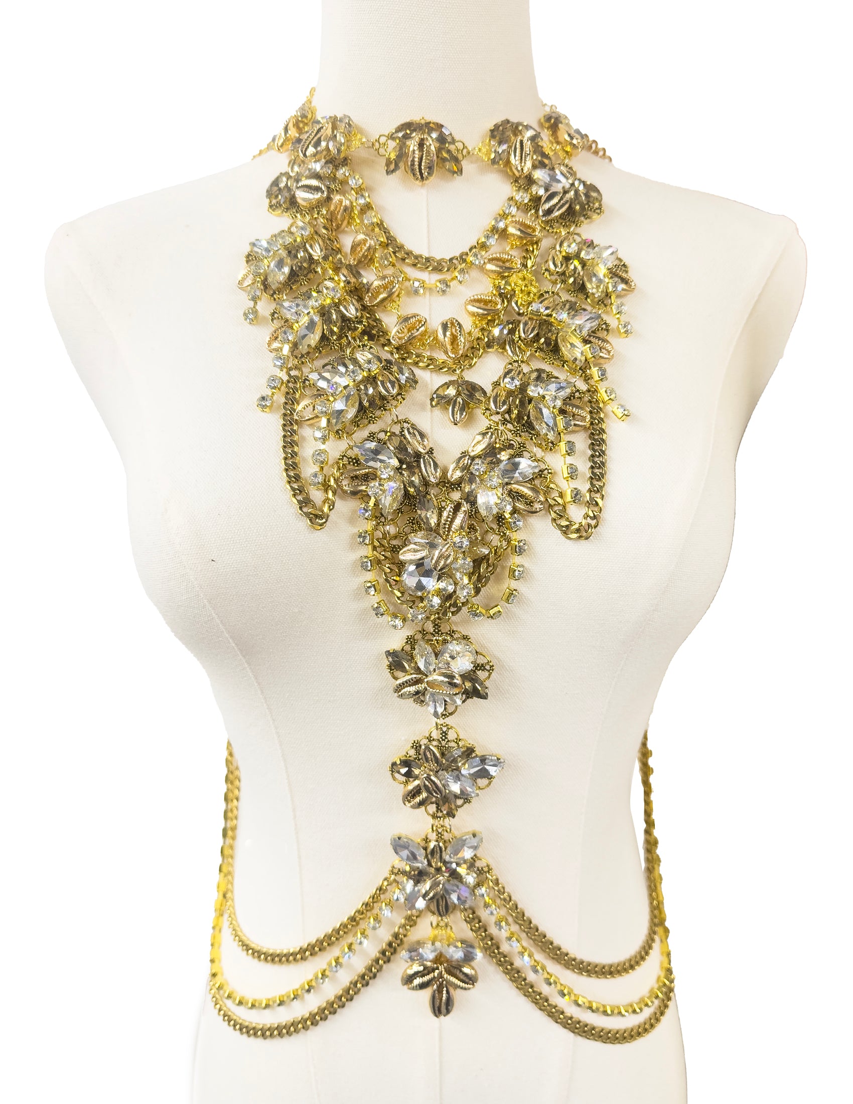 Lavish in luxury in the Cowrie shell collection, thought to represent wealth and prosperity. Gold dipped and set among spectacular gold hardware, pearls and clear crystals make these pieces shine so that you will be the center of every conversation.