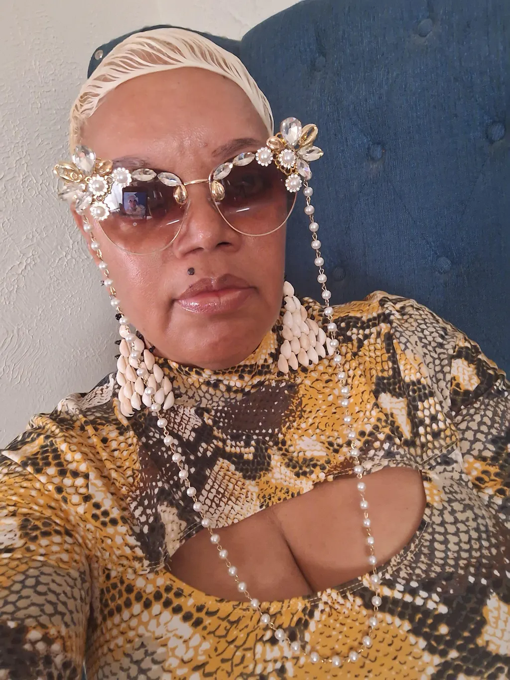 Gold sunglasses with rhinestone, cowrie shells, and pearls. These glasses will make a statement.