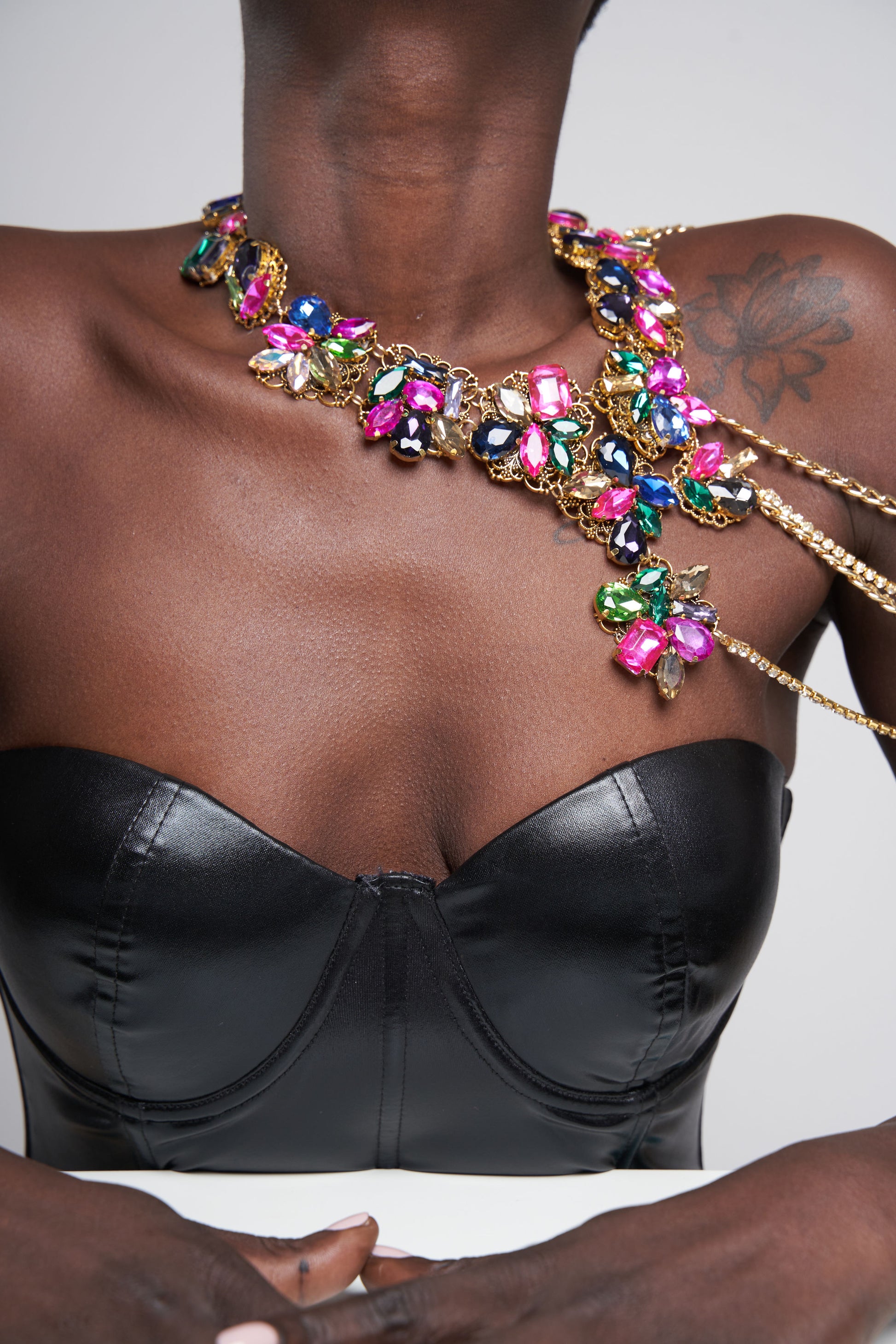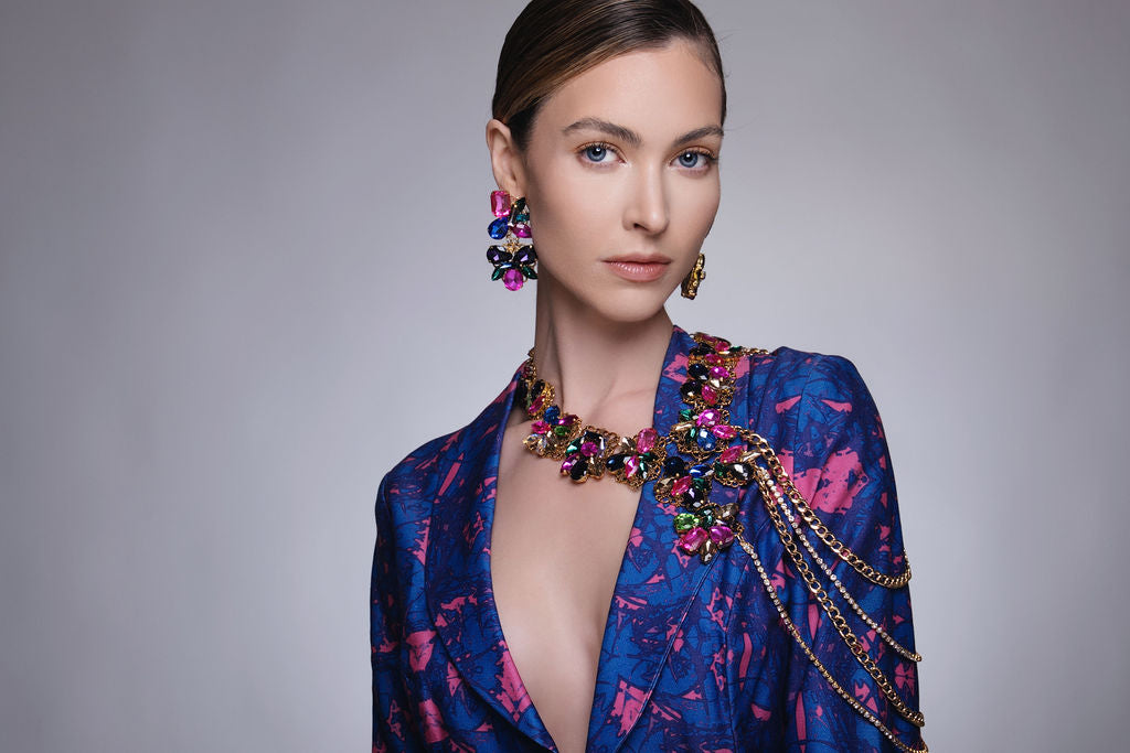 Gorgeous, colorful jewels set in gold tones define this statement collection. Daring yet timeless, emerald, cyan, fuchsia and lavender combine to make magic in these pieces that demand to be seen and bring the drama.
