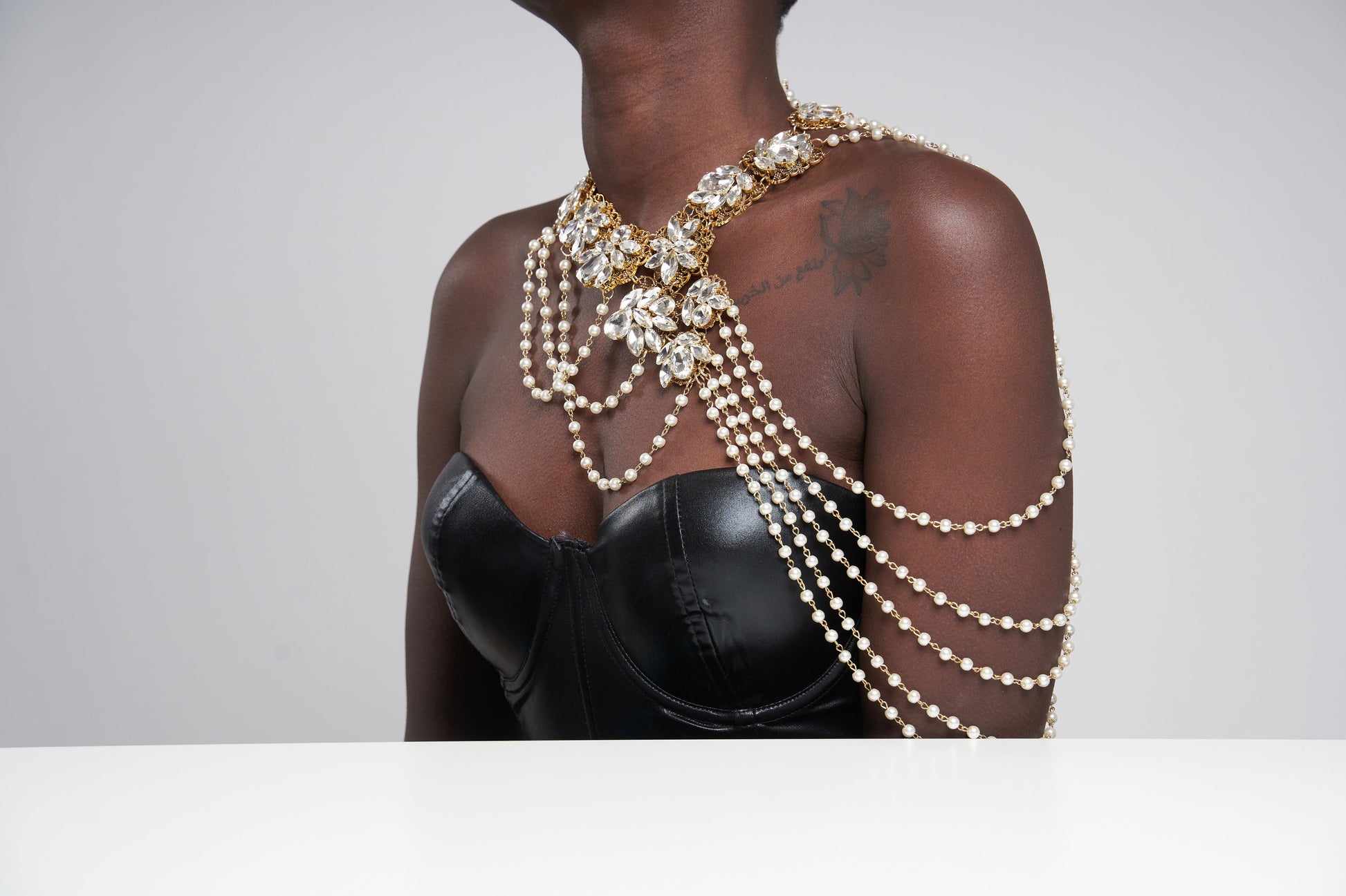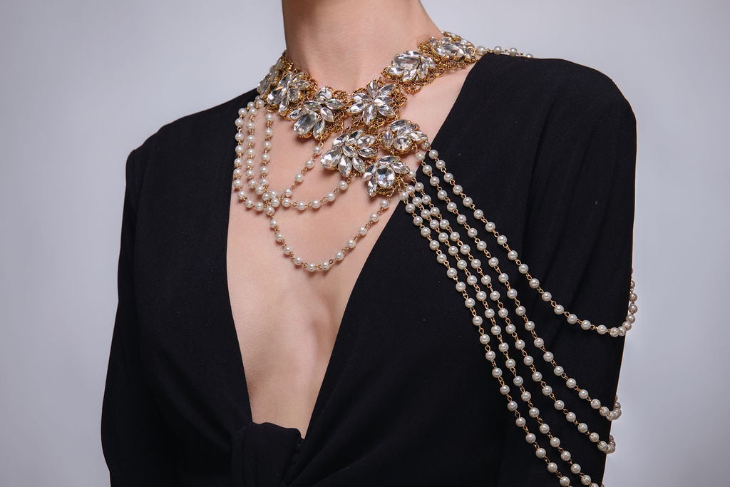 Rhinestone clusters adorn gold toned hardware while lengths of pearls drape you in grand fashion. Exquisite opulence meets classic style in this collection, guaranteed to draw every eye to you.