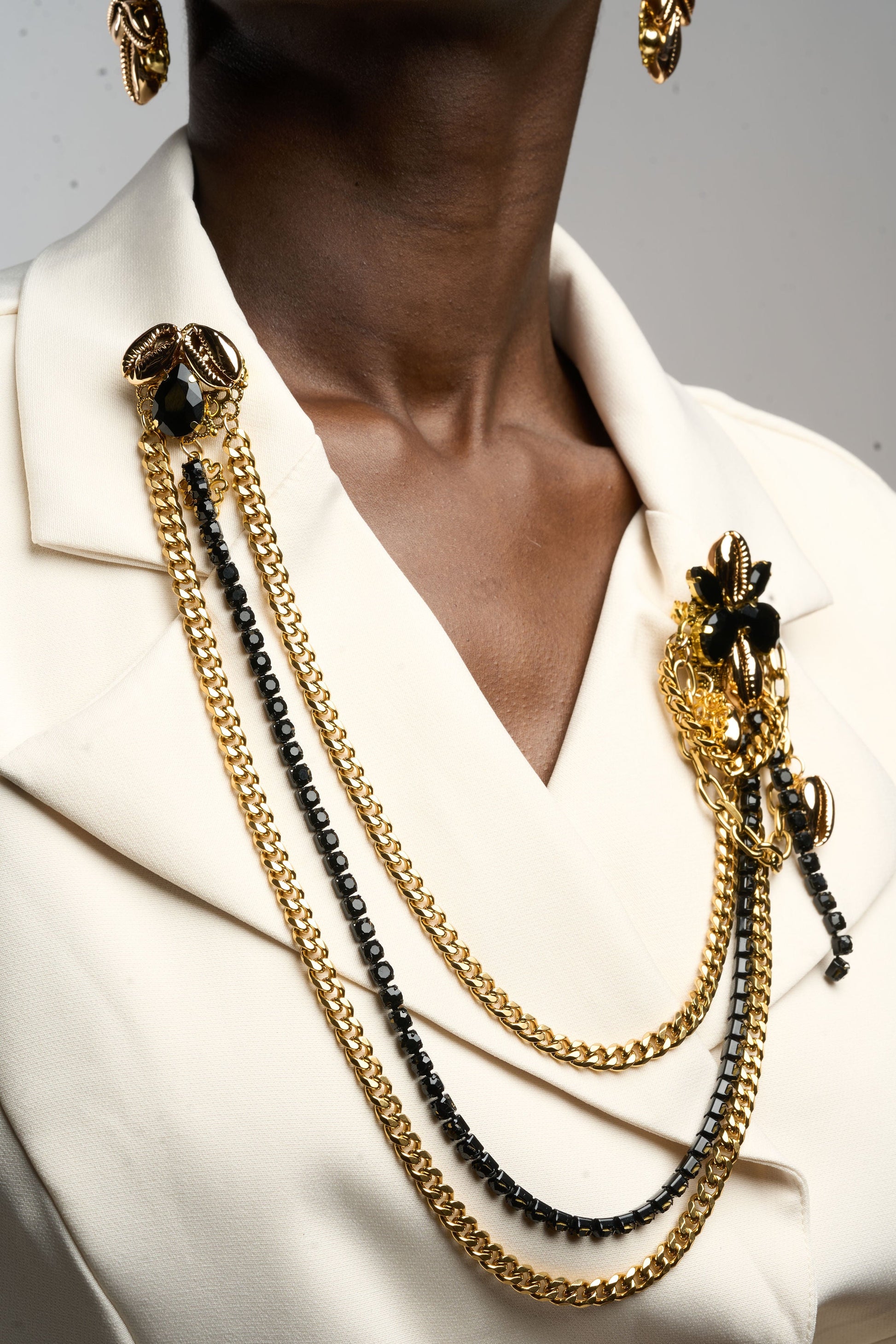 Double Cowrie shell and black rhinestone brooch with draping 14k gold filled chain. This piece is made with Electroplated Natural Cowrie Shells. Made by hand with love.