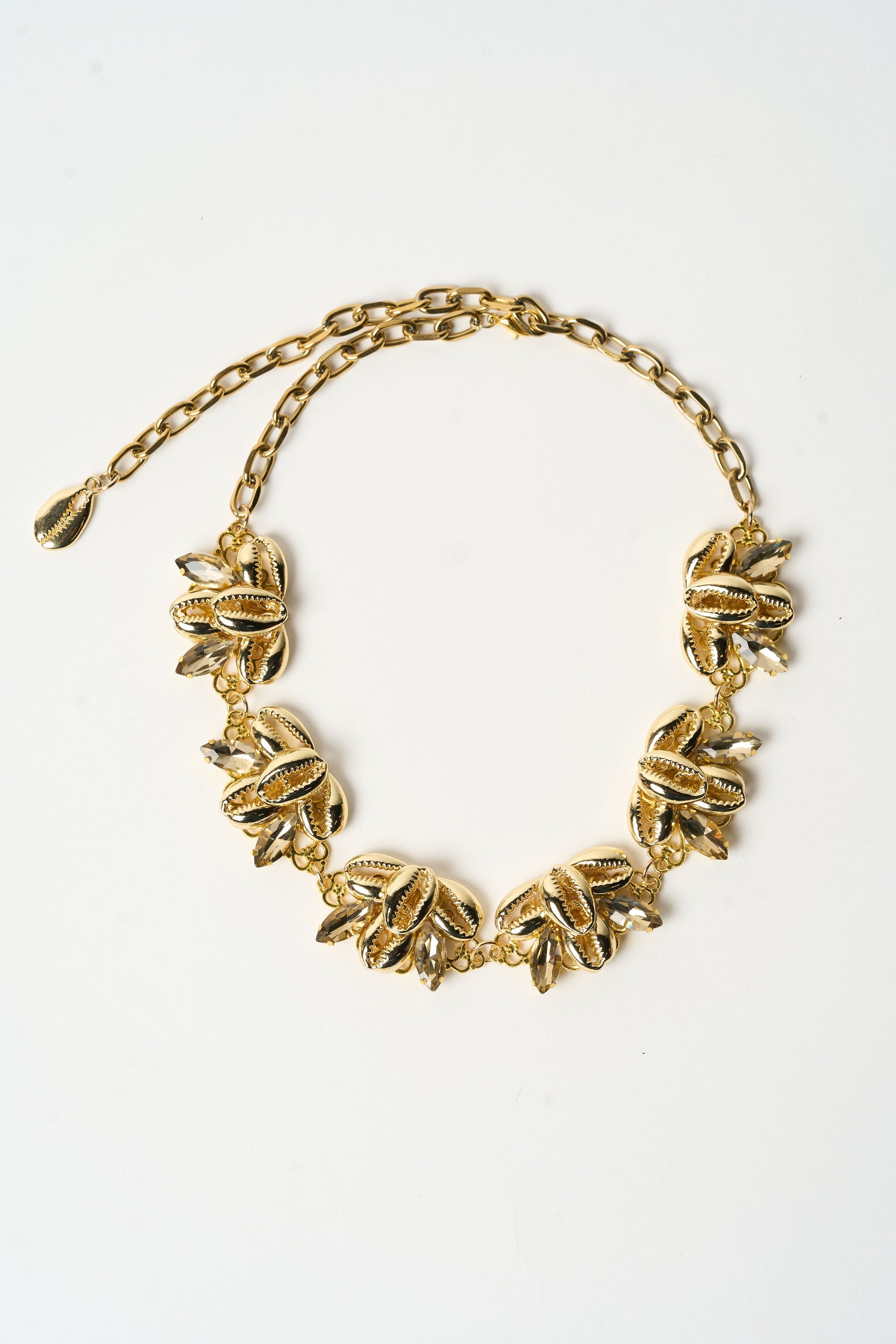 14k gold plated Cowrie Shells with topaz colored rhinestones. This necklace is adjustable to fit all neck sized. Handmade with love.