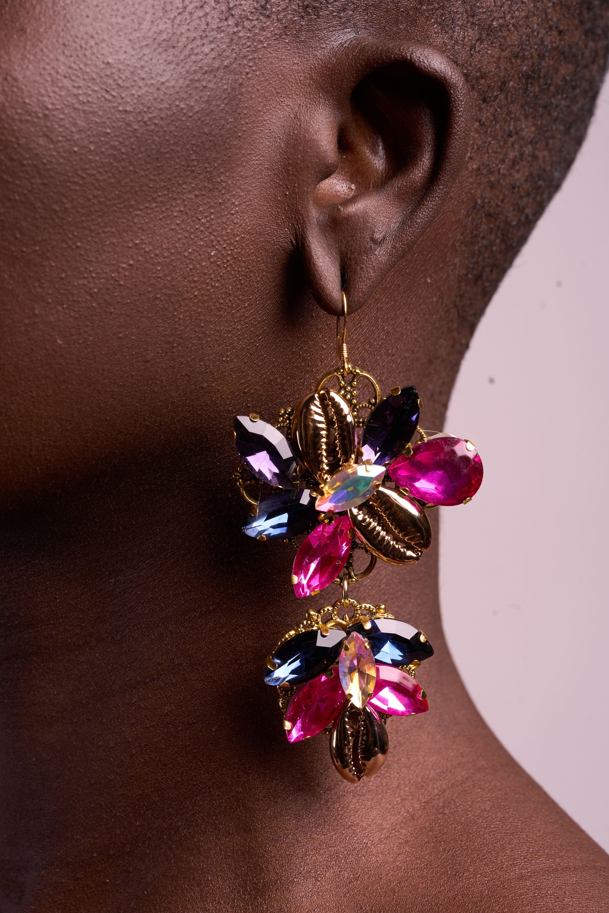 A beautiful array of colorful rhinestones and Cowrie Shells. This piece is made with Electroplated Natural Cowrie Shells. Made by hand with love.