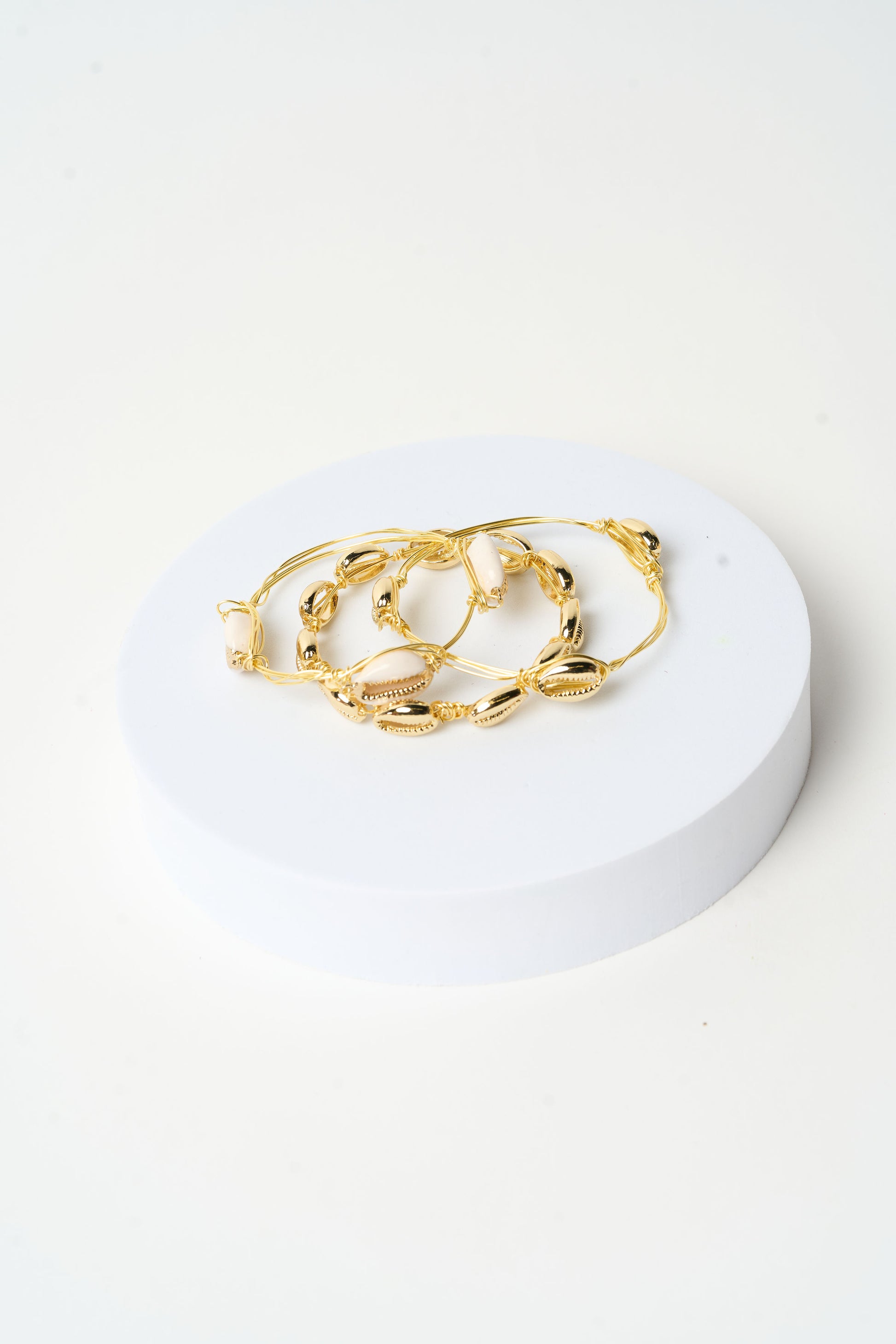 A unique and vibrant statement piece. Our wire wrapped bangles are handmade with a combination of cowrie shells, pearls, and colorful gems. Each is one-of-a-kind on its own, or stackable to accessorize any outfit. Embrace your inner boho and add these beautiful bangles to your jewelry collection today!